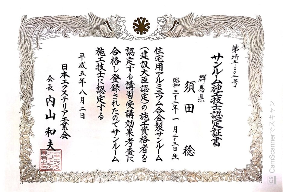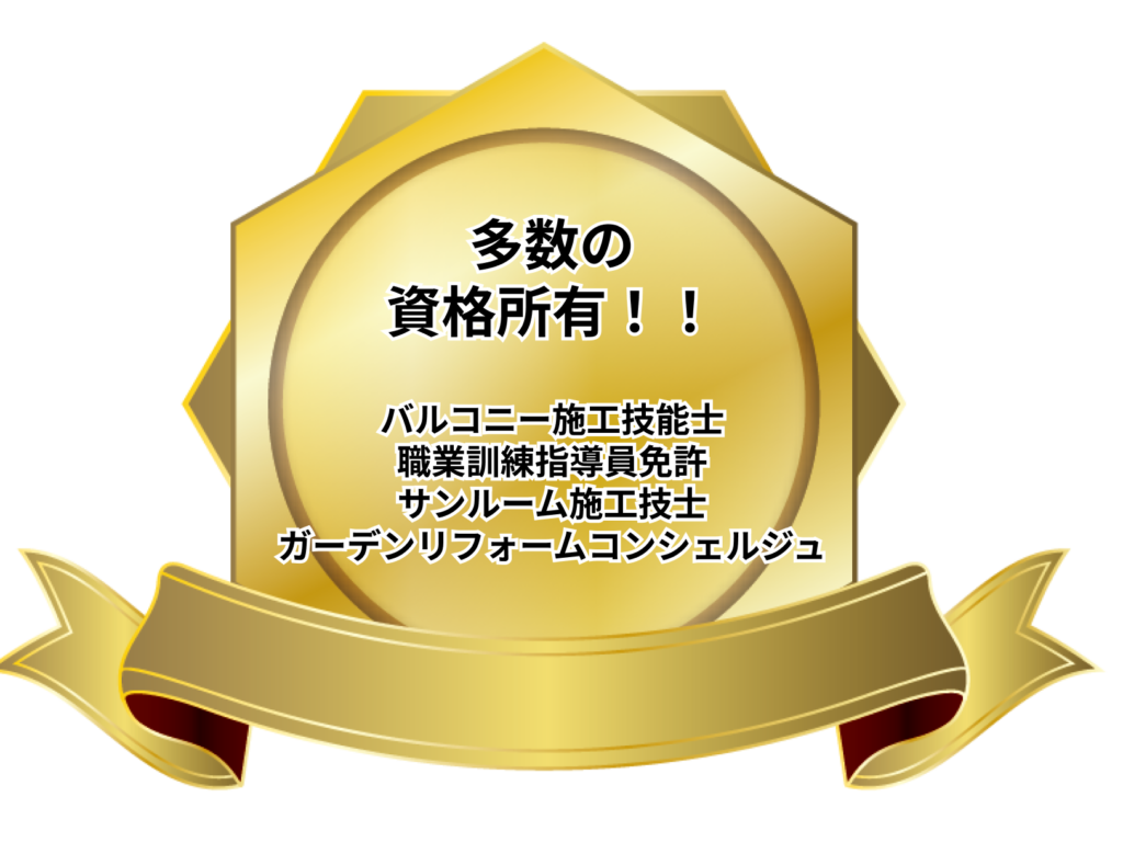 バルコニー施工技能士 / 職業訓練指導員免許 / サンルーム施工技士 / ガーデンリフォームコンシェルジュ
